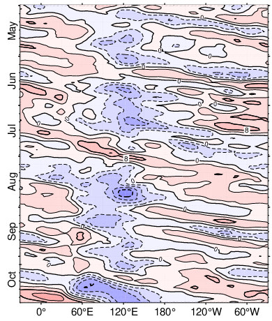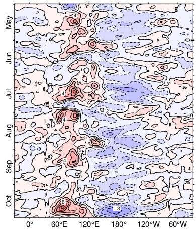 - 対流活動は、波数1が卓越した上層の大規模発散域となったインド洋東部~海洋大陸では10~20Sと10~20Nで対流活動が顕著に活発で、カリブ海周辺でも局所的に活発だった(図9)。赤道季節内振動は、中旬にインド洋で振幅が大きくなり、下旬にかけて海洋大陸に東進した(図10)。