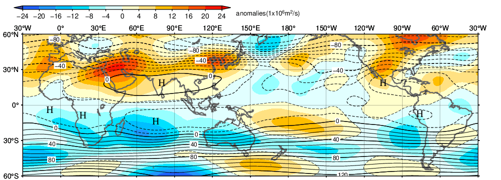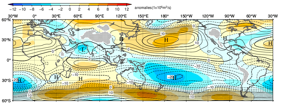 - 対流圏上層では、海洋大陸東部~太平洋中部で南北両半球対の低気圧性循環偏差となった他は、広く南北両半球対の高気圧性循環偏差となり、特にインド洋西部は顕著な高気圧性循環偏差となった(図11)。