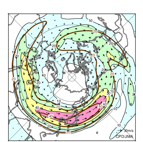 ![]() 等値線の間隔は10m/s毎。平年の20m/s毎の等値線を茶色で表す。平年値は1991〜2020年の平均値。 |