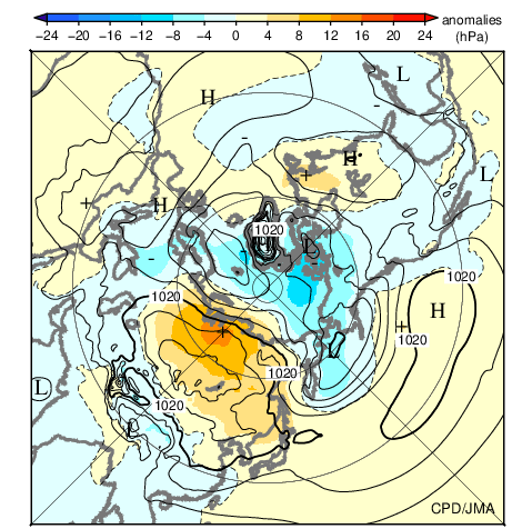 - 海面気圧(図15)は、西シベリア~北日本にかけて顕著な正偏差となり、中央シベリア~中国東北区では記録的(年々変動の標準偏差の3倍以上)となった。ベーリング海~ノルウェー海にかけては負偏差となり、カナダ北部では顕著となった。