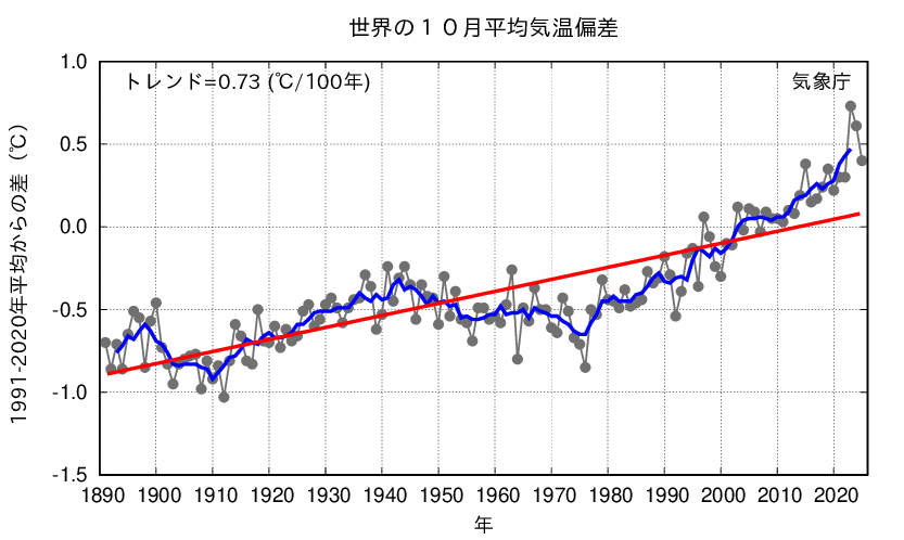 - 世界の月平均気温偏差は+0.40℃(速報値)で、1891年の統計開始以降、10月として3番目に高い値となった。10月の世界の平均気温は、上昇傾向が続いており、長期的な上昇率は約0.73℃/100年(速報値)である(図5)。