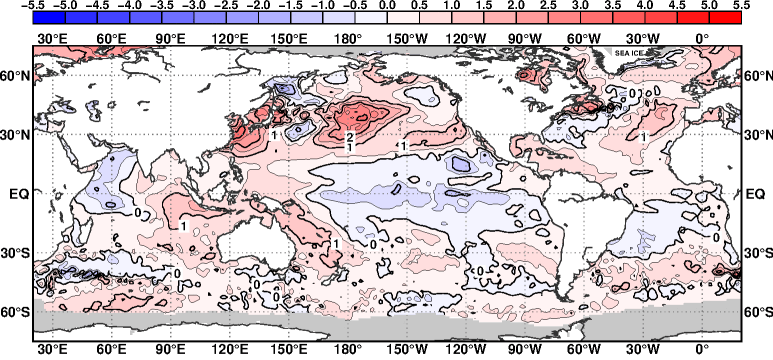 - 南大西洋では、中緯度帯で顕著な正偏差、亜熱帯の西部で顕著な負偏差となった。