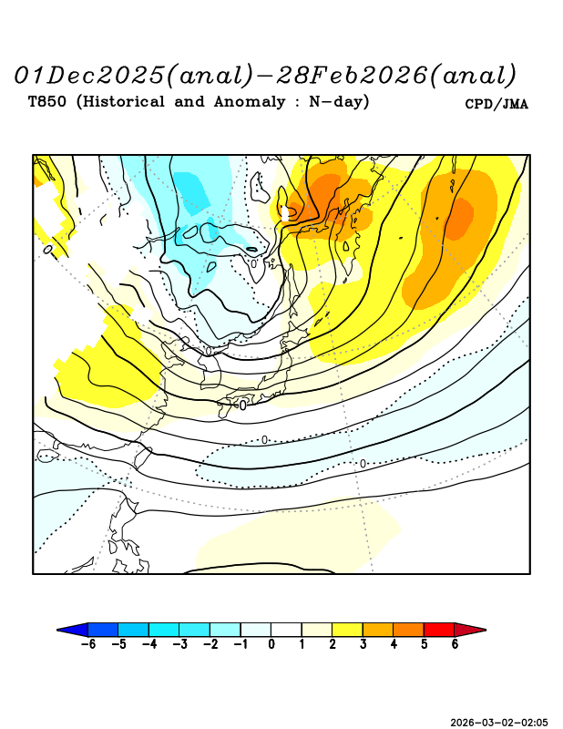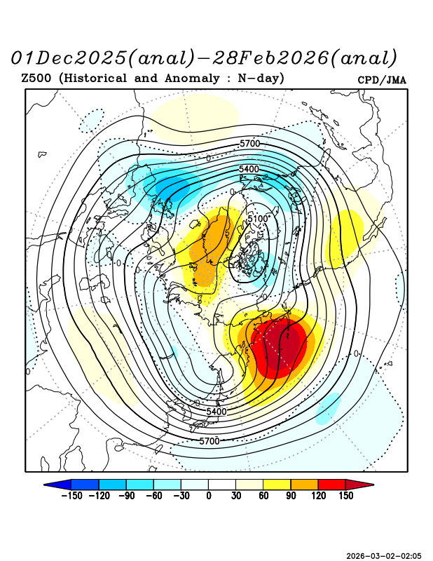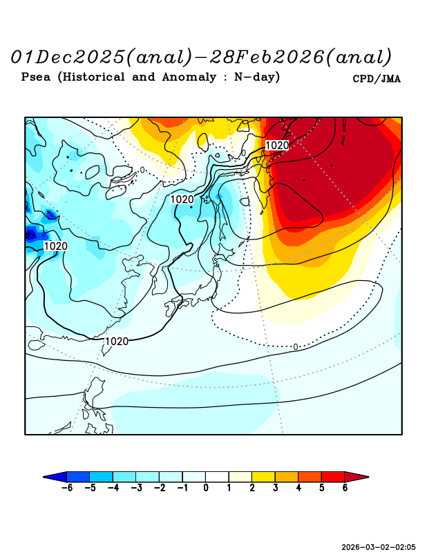寒帯前線ジェット気流は中央シベリア付近から北日本付近にかけてやや南に偏って流れ、500hPa高度では、極渦がサハリン付近に南下した一方、アリューシャン近海ではリッジが明瞭だった。海面気圧は、オホーツク海を中心に負偏差となっており、低気圧が北日本付近を通過してオホーツク海付近に進みやすく、冬型の気圧配置が強まる時期もあった。一方、日本の南は相対的に気圧が高く、東日本以西は高気圧に覆われやすかった。フィリピンの東を中心に強い負偏差で、沖縄・奄美から本州付近には南からの湿った空気が入りづらく、南岸低気圧が発生しにくかった。全国的に暖かい空気が流れ込みやすかったが、寒気の影響を受けやすい時期もあった。