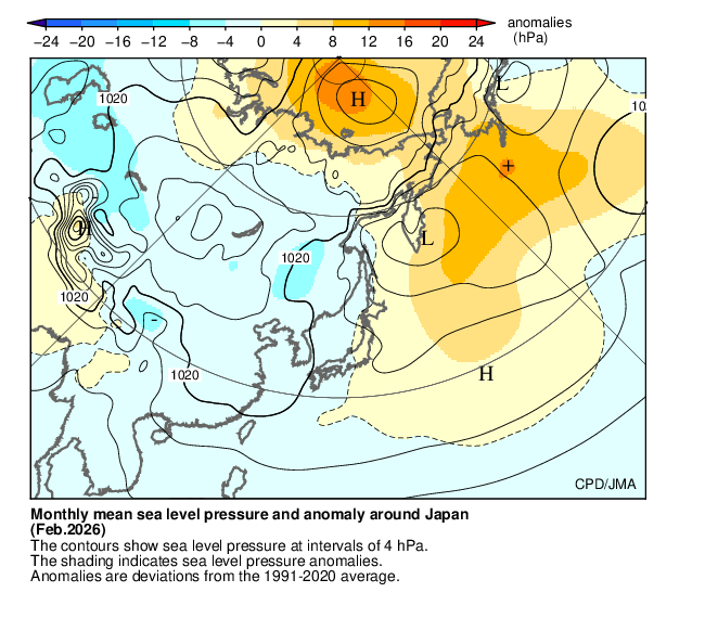寒帯前線ジェット気流が北日本付近で南に蛇行し、全国的に寒気の影響を受けた時期もあったが、500hPa高度では日本付近で正偏差となり、上空の寒気の影響を受けにくかった。海面気圧は、アリューシャン低気圧とシベリア高気圧は弱かった。低気圧が日本海から北海道付近を通過しやすく、北日本中心に低気圧に向かって暖かい空気が流れ込みやすかった。このため、北日本ほど高温傾向となった。また、冬型の気圧配置は長続きせず、東・西日本と沖縄・奄美は高気圧に覆われやすかった。