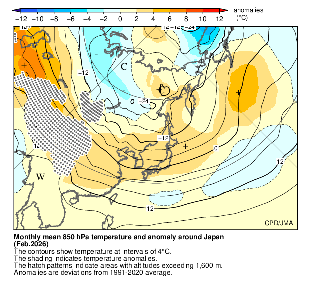 2026年2月平均500hPa高度・偏差の分布(単位:m) 2026年2月平均850hPa気温・偏差の分布(単位:℃)