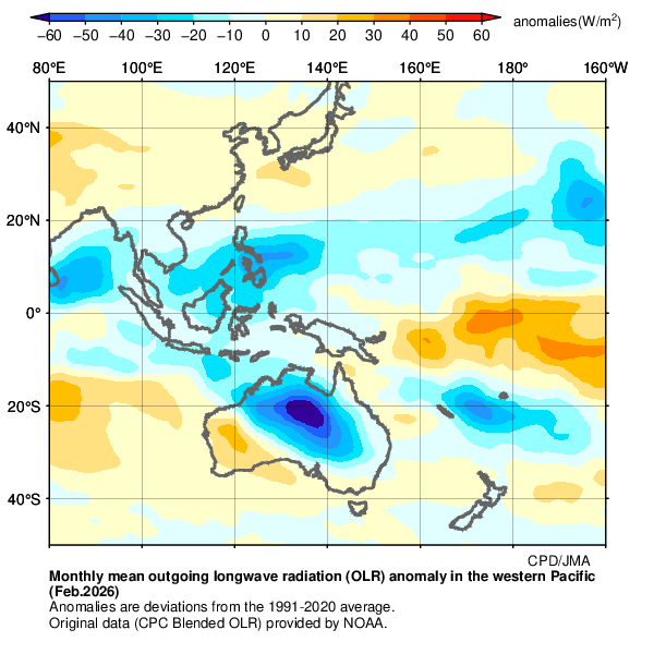 ※ 米国海洋大気庁(NOAA)が作成する外向き長波放射量(OLR)のデータが欠損により利用できない場合には、OLR偏差図は描画されません。