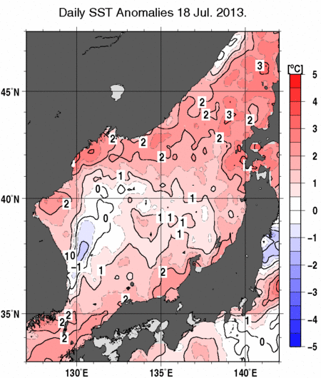 7月中旬の日本海は、平年では海面水温が1℃程度上昇する時期ですが、日本海北部では日照時間が平年より多く、風が平年より弱かったため、海面水温が平年より大きく上昇しました。その結果、日本海北部では、海面水温が平年より2℃以上高い海域が拡大しました。日本海中部・南部では、海面水温が低下した海域もみられましたが、朝鮮半島東方を除き海面水温が平年より高い状態が続いています。