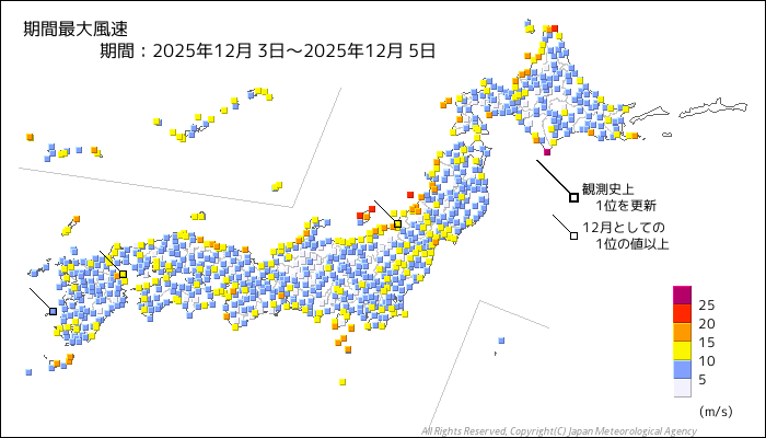 特定期間の風の状況(2025年12月 3日~2025年12月 5日)