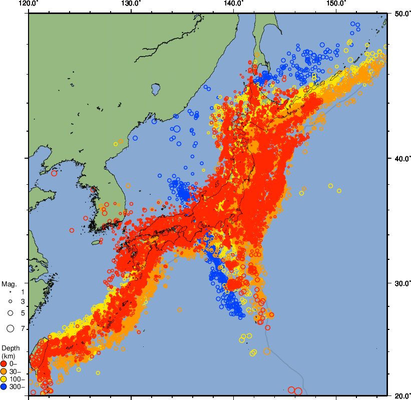 Home > Publications/Periodicals > The Seismological Bulletin of Japan > 1. Earthquakes > Epicenter Distribution