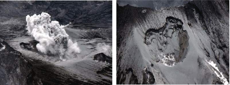 図2 昭和火口の状況(16日 右:南東側より撮影 左:南側より撮影)