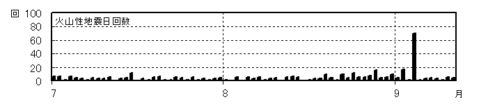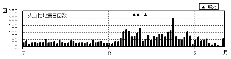 図2 浅間山 火山性地震の日別回数(2008年7月1日〜2008年9月11日)