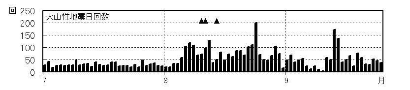 噴煙量の多い状態が続き、噴煙高度は火口縁上概ね200mで推移した。火山性地震の発生回数は減少しているが、地震回数が増加し始めた8月18日以前と比べてやや多い状態が続いている。