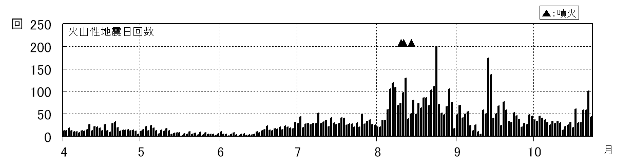 図2 浅間山 火山性地震の日別回数(2008年4月1日〜2008年10月23日)