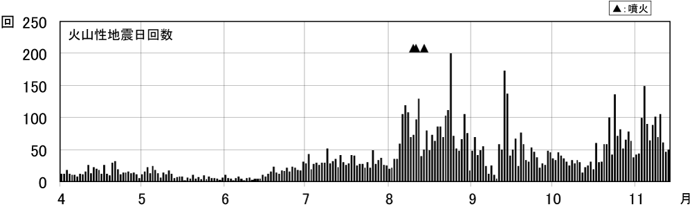 図2 浅間山 火山性地震の日別回数(2008年7月1日〜2008年11月13日)