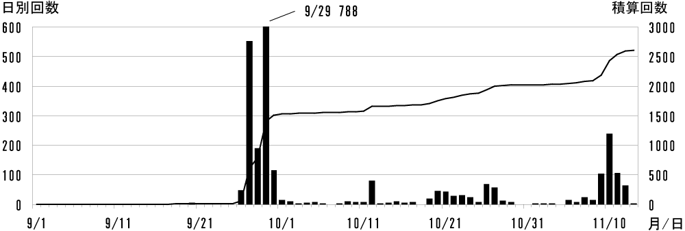 図3 雌阿寒岳 火山性地震の日別回数(2008年9月1日〜2008年11月13日)
