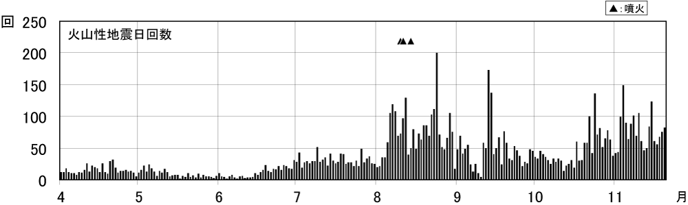 噴煙高度は火口縁上200〜300mで推移した。火山性地震はやや多い状態が続いている。
