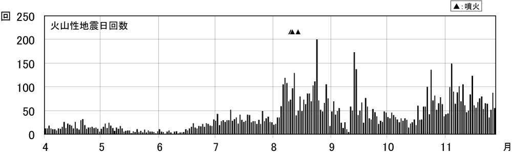 御岳(おたけ)火口では小規模な噴火が時々発生した。これらの噴火に伴う噴煙の高さは火口縁上400〜800mであった。火山性地震及び火山性微動は消長を繰り返しながらやや多い状態が続いている。