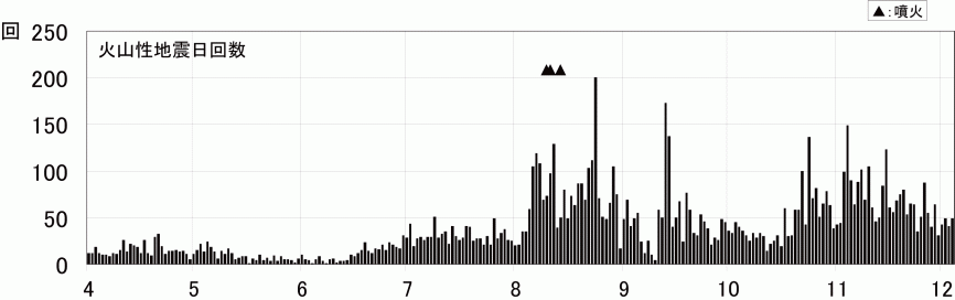 11月28日、30日及び12月1日に火山性地震が一時的にやや増加した。火山性微動は時々発生している。島内に設置した遠望カメラでは、噴気が時々観測され、高さは火口縁上20〜200mで推移した。