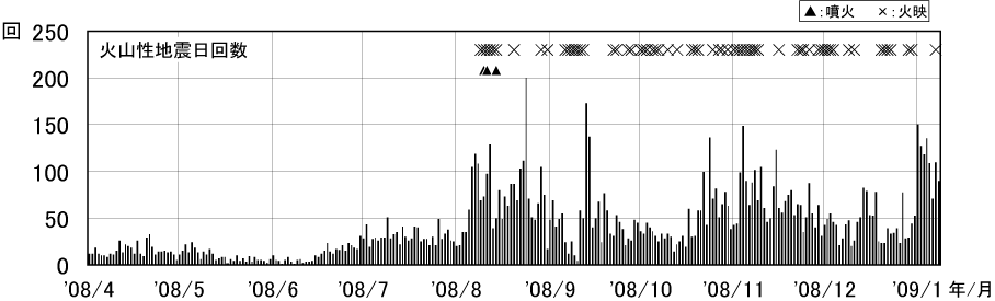図2 浅間山 火山性地震の日別回数(2008年4月1日〜2009年1月8日)