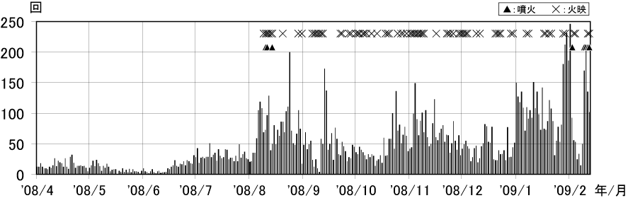 図2 浅間山 火山性地震の日別回数(2008年4月1日〜2009年2月12日)