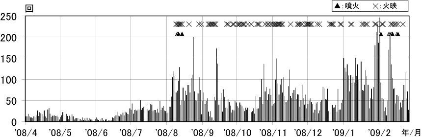 図2 浅間山 火山性地震の日別回数(2008年4月1日〜2009年2月26日)
