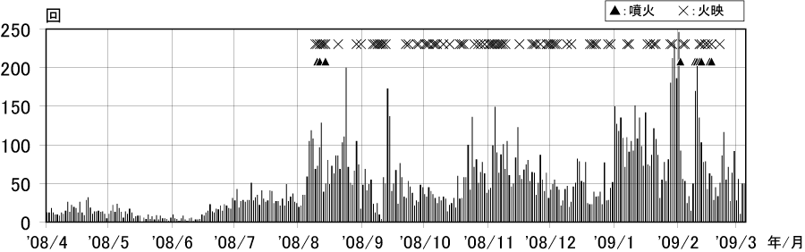 図2 浅間山 火山性地震の日別回数(2008年4月1日〜2009年3月5日)