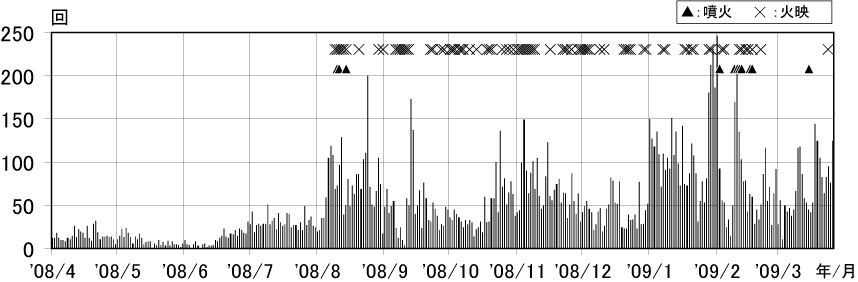 図2 浅間山 火山性地震の日別回数(2008年4月1日〜2009年3月26日)
