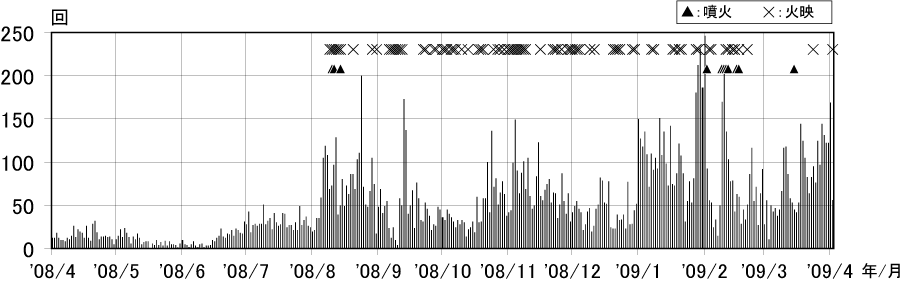 図2 浅間山 火山性地震の日別回数(2008年4月1日〜2009年4月2日)