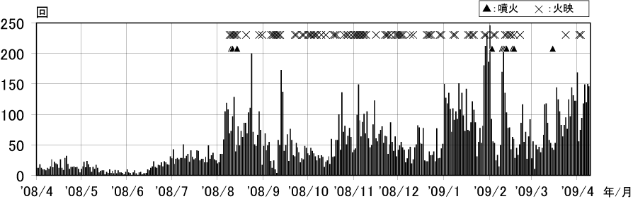 図2 浅間山 火山性地震の日別回数(2008年4月1日〜2009年4月9日)
