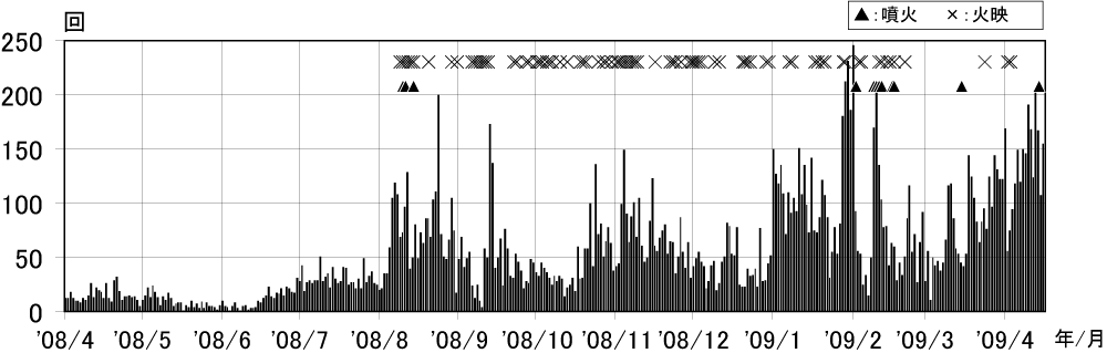 図2 浅間山 火山性地震の日別回数(2008年4月1日〜2009年4月16日)