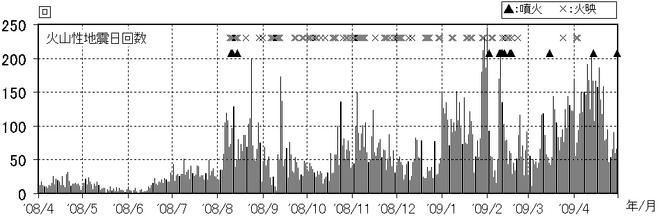 図2 浅間山 火山性地震の日別回数(2008年4月1日〜2009年4月30日)