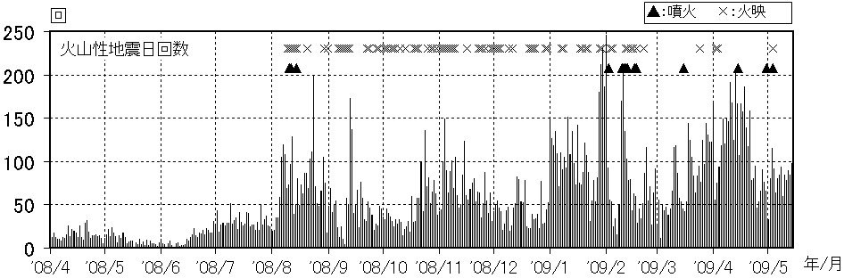図2 浅間山 火山性地震の日別回数(2008年4月1日〜2009年5月14日)