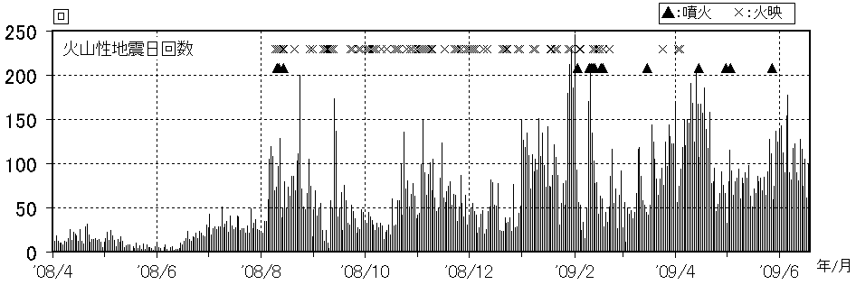 図2 浅間山 火山性地震の日別回数(2008年4月1日〜2009年6月25日)