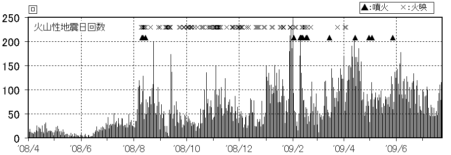 図2 浅間山 火山性地震の日別回数(2008年4月1日〜2009年7月23日)