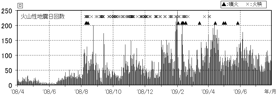 図2 浅間山 火山性地震の日別回数(2008年4月1日〜2009年7月30日)
