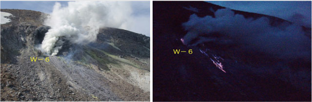 5月6日に現地調査を実施した結果、大穴火口のW-6噴気孔の周辺で硫黄が燃焼し、青白い煙が上がっているのを確認した。また、硫黄の燃焼した個所が夜間には、赤又は白く光って見えるのを確認した。