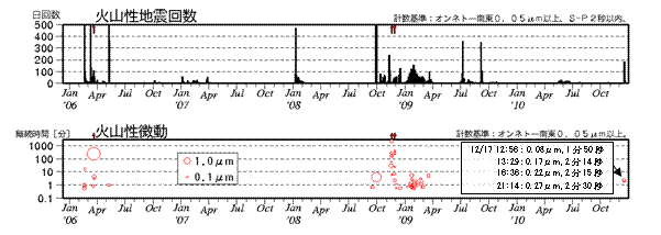 図1 雌阿寒岳 火山性地震と火山性微動の経過グラフ(2006年1月1日〜2010年12月23日 ↑印は噴火を示す)