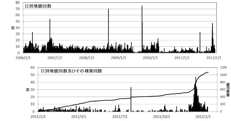 図2 口永良部島 火山性地震の発生回数(2006年1月1日〜2012年1月12日)