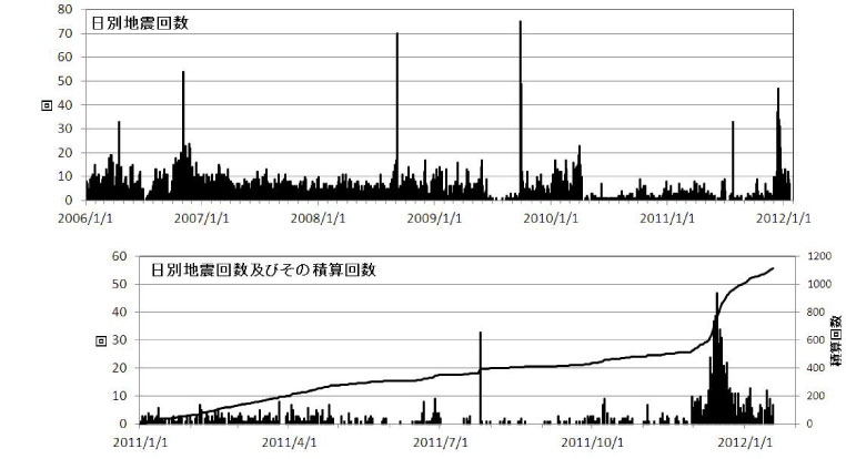 2011年12月11日から火山性地震の回数が多くなり、火山活動が高まった状態となったが、12月25日頃から回数は緩やかに減少し、 1月5日以降は少ない状態で経過している。