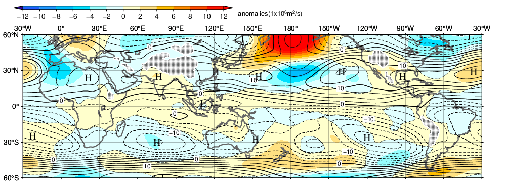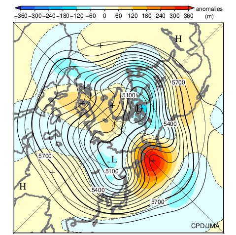 ![]() Fig.10 Monthly mean 500-hPa height and anomaly in the Northern Hemisphere (December 2025) The contours show 500-hPa height at intervals of 60 m. The shading indicates its anomalies. The base period for the normal is 1991-2020. |