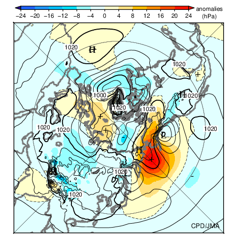 ![]() Fig.12 Monthly mean sea level pressure and anomaly in the Northern Hemisphere (December 2025) The contours show sea level pressure at intervals of 4 hPa. The shading indicates its anomalies. The base period for the normal is 1991-2020. |