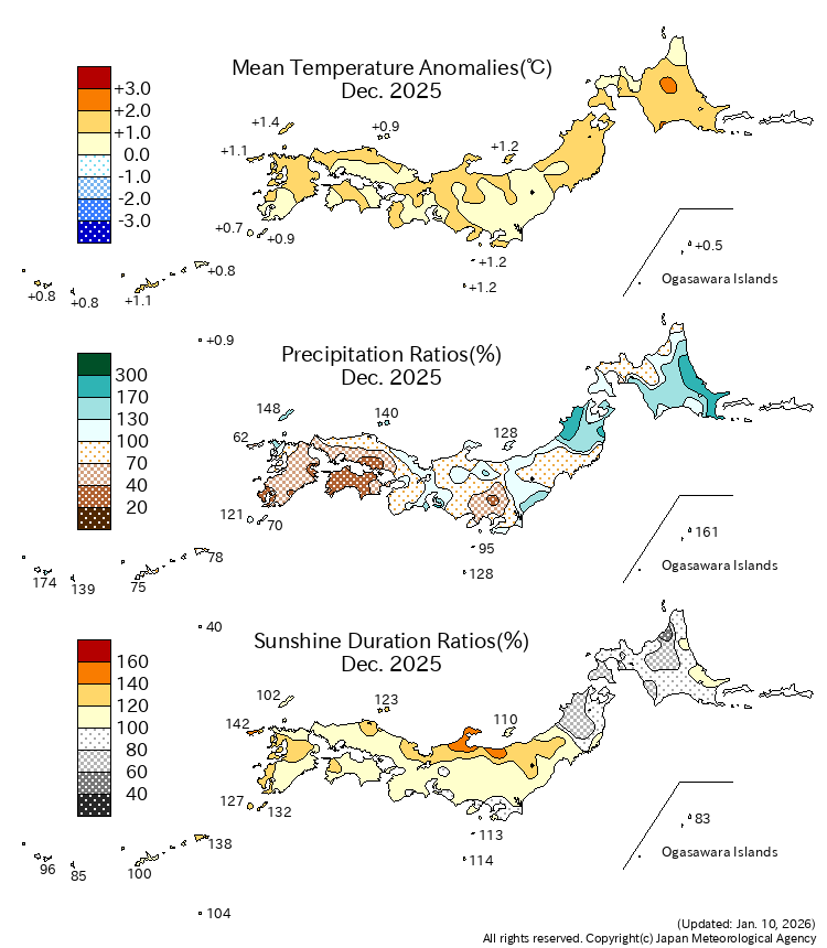 Fig.1 Monthly climate anomaly/ratio over Japan (December 2025) Top: temperature anomalies (degree C) Middle: precipitation ratio (%) Bottom: sunshine duration ratio (%) The base period for the normal is 1991-2020. |
