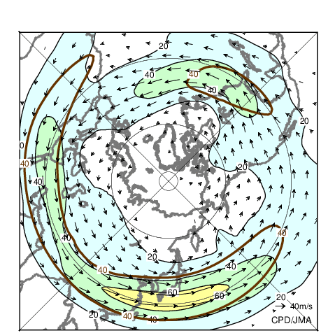 ![]() Fig.11 Monthly mean 200-hPa wind speed and vectors in the Northern Hemisphere (February 2026) The black lines show wind speed at intervals of 20 m/s. The brown lines show its normal at intervals of 40 m/s. The base period for the normal is 1991-2020. |