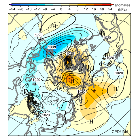 ![]() Fig.12 Monthly mean sea level pressure and anomaly in the Northern Hemisphere (February 2026) The contours show sea level pressure at intervals of 4 hPa. The shading indicates its anomalies. The base period for the normal is 1991-2020. |