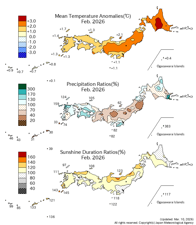 Fig.1 Monthly climate anomaly/ratio over Japan (February 2026) Top: temperature anomalies (degree C) Middle: precipitation ratio (%) Bottom: sunshine duration ratio (%) The base period for the normal is 1991-2020. |