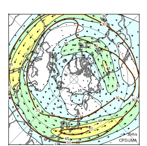 ![]() Fig.11 Monthly mean 200-hPa wind speed and vectors in the Northern Hemisphere (March 2026) The black lines show wind speed at intervals of 15 m/s. The brown lines show its normal at intervals of 30 m/s. The base period for the normal is 1991-2020. |