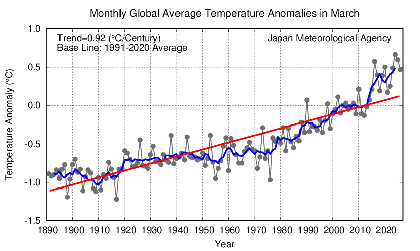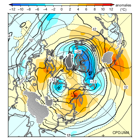 ![]() Fig.13 Monthly mean 850-hPa temperature and anomaly in the Northern Hemisphere (March 2026) The contours show 850-hPa temperature at intervals of 4 degree C. The shading indicates its anomalies. The base period for the normal is 1991-2020. |