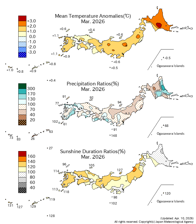 Fig.1 Monthly climate anomaly/ratio over Japan (March 2026) Top: temperature anomalies (degree C) Middle: precipitation ratio (%) Bottom: sunshine duration ratio (%) The base period for the normal is 1991-2020. |
